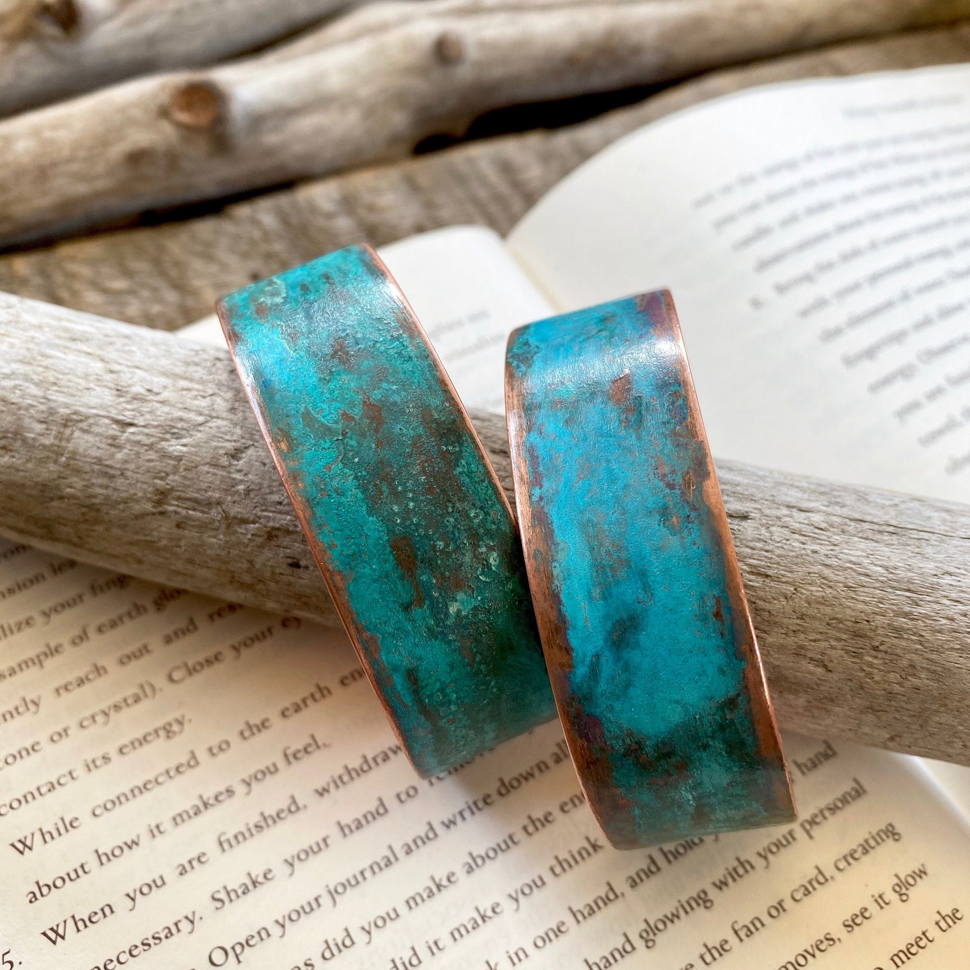 3/4 inch wide heavy copper cuffs with a naturally processed turquoise patina. Each is unique with its own pattern and shades of blue-green.