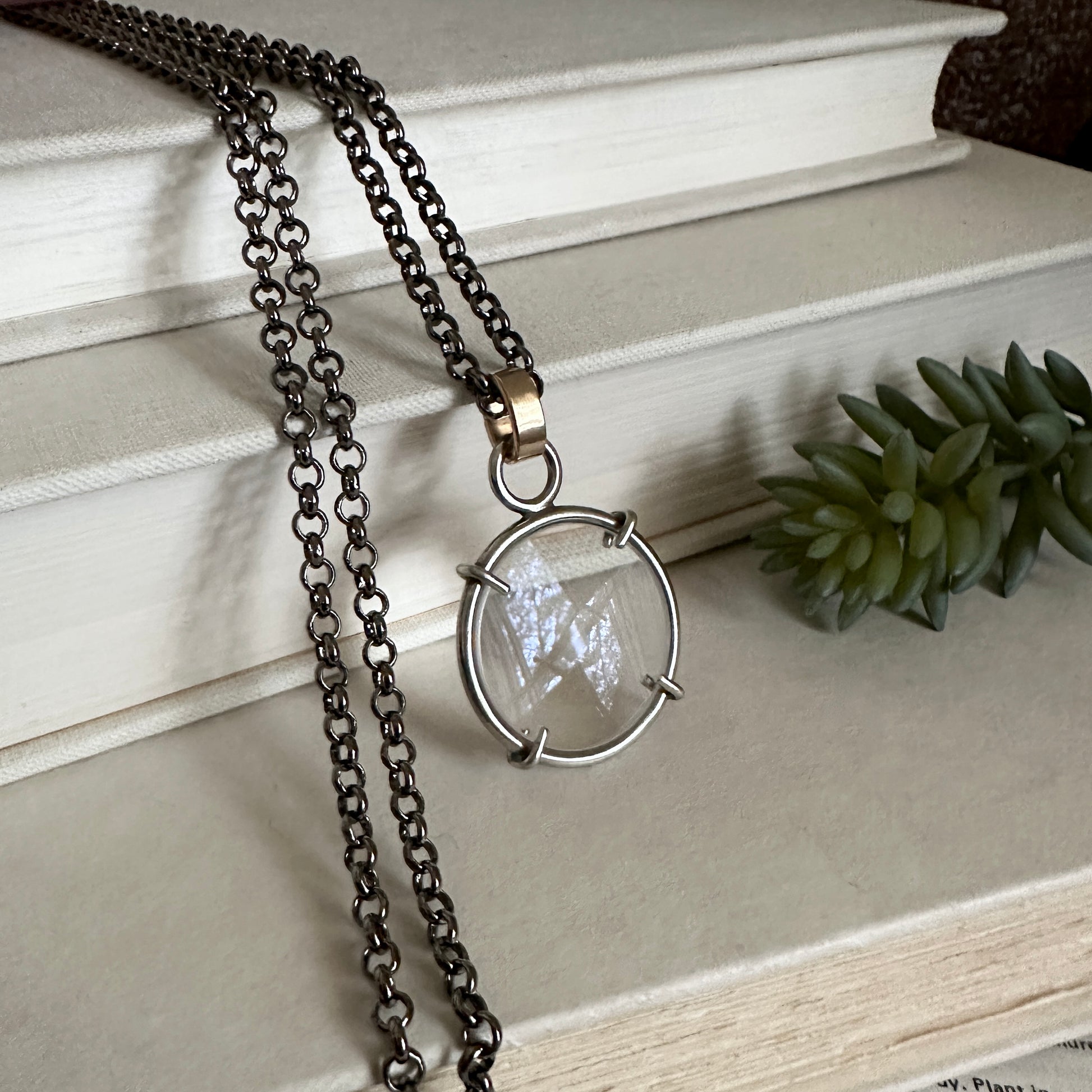 SET in heavy gauge STERLING SILVER with a heavy solid brass bail for golden contrast. Hand fabricated, one of a kind. Full pendant approximately 1.5" x 1".