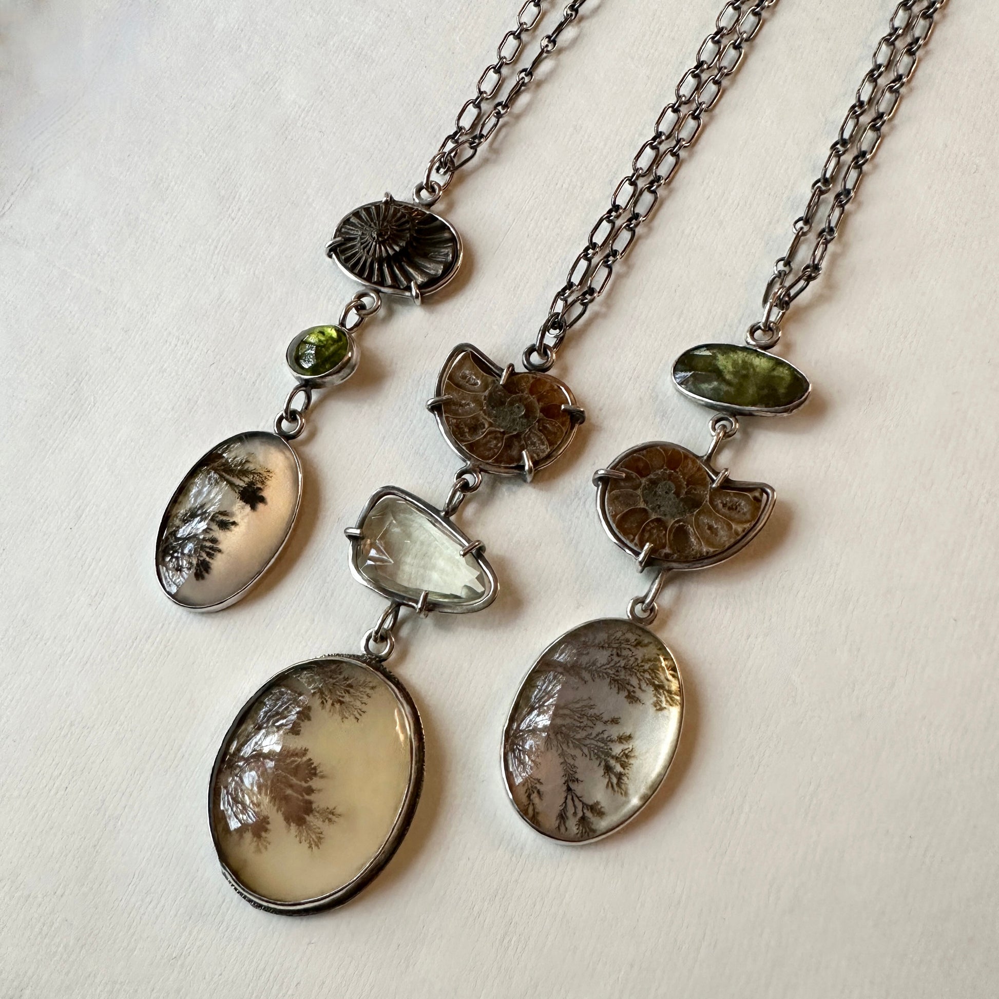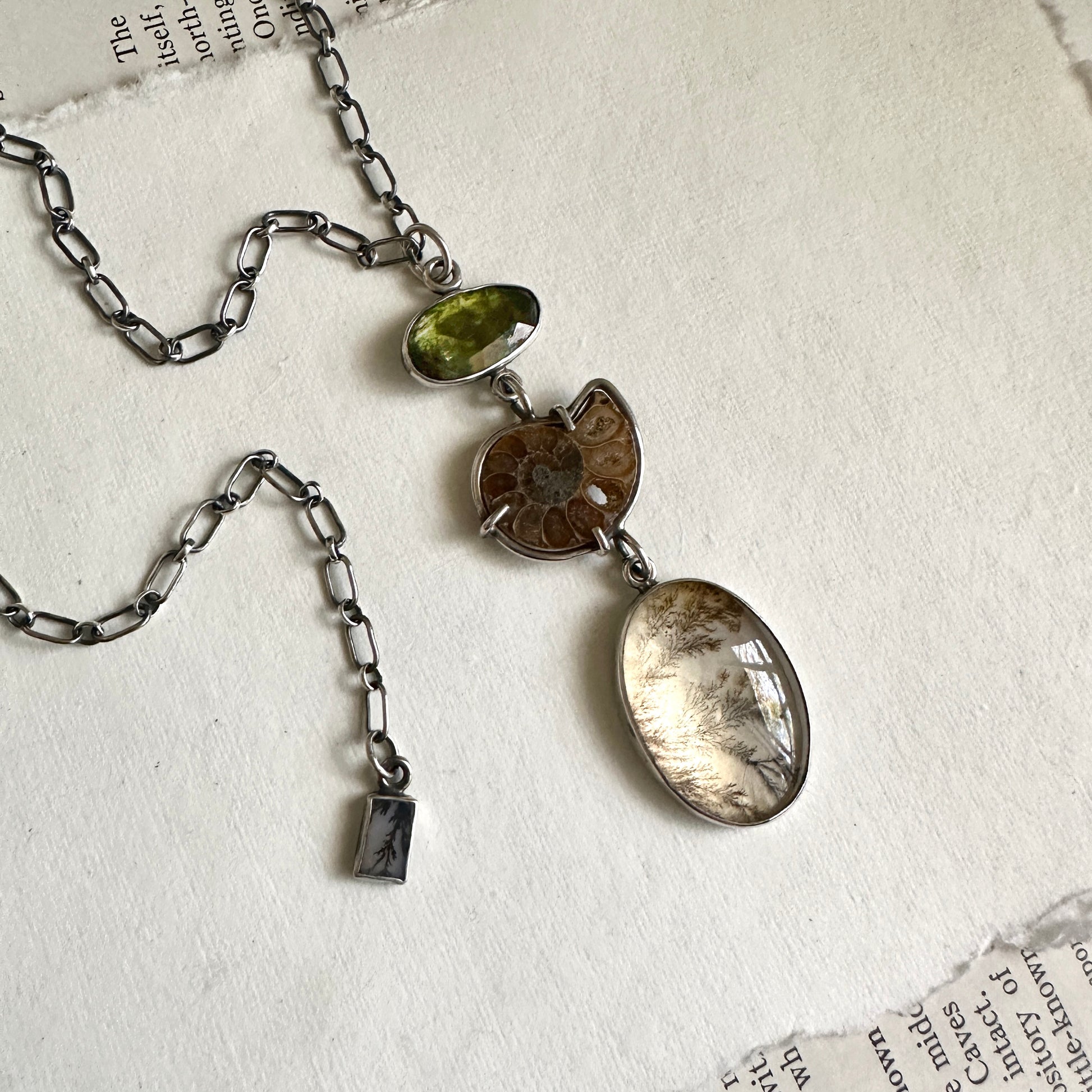 One-of-a-kind four stone necklace featuring a large dendritic agate doublet, ammonite and green tourmaline, set in sterling silver.