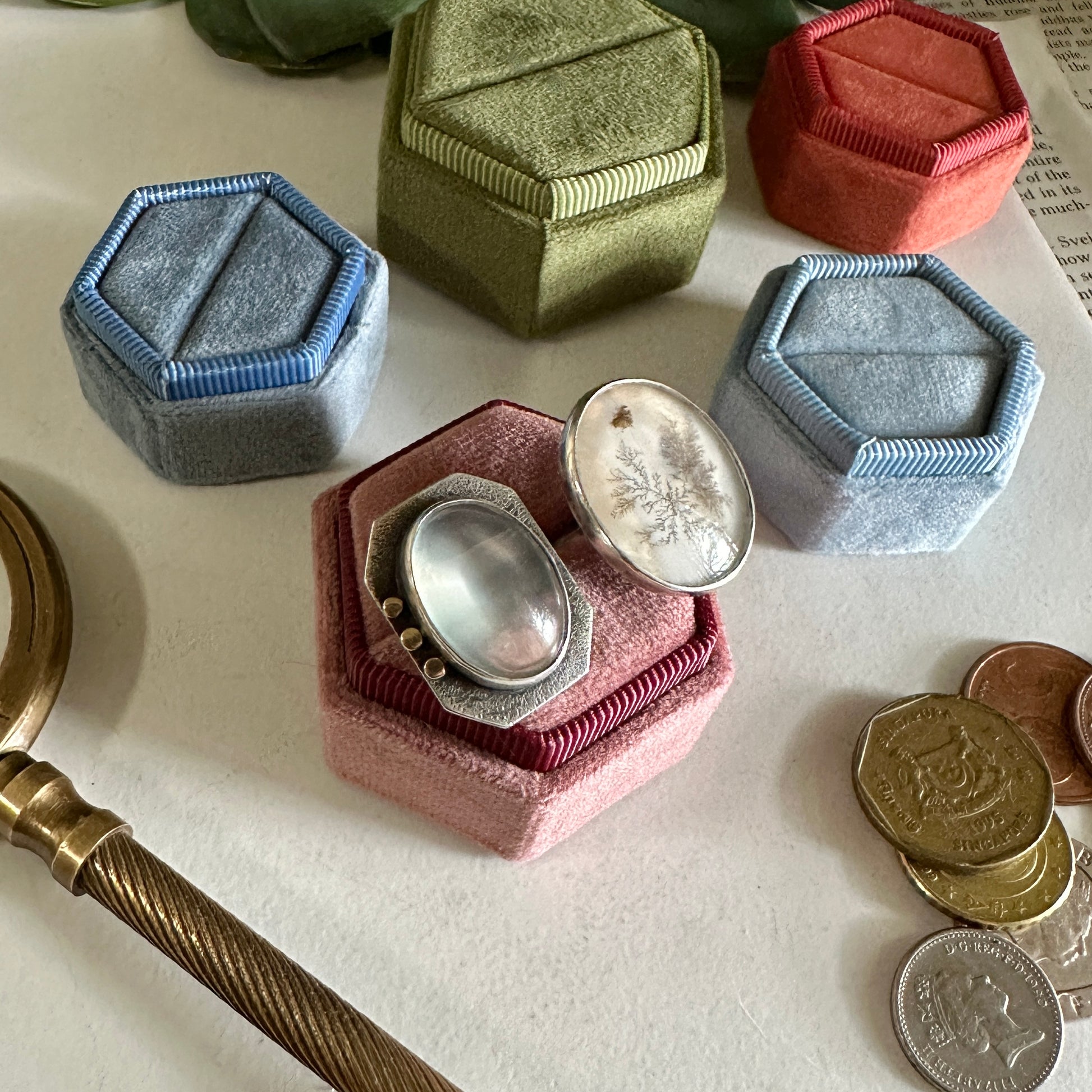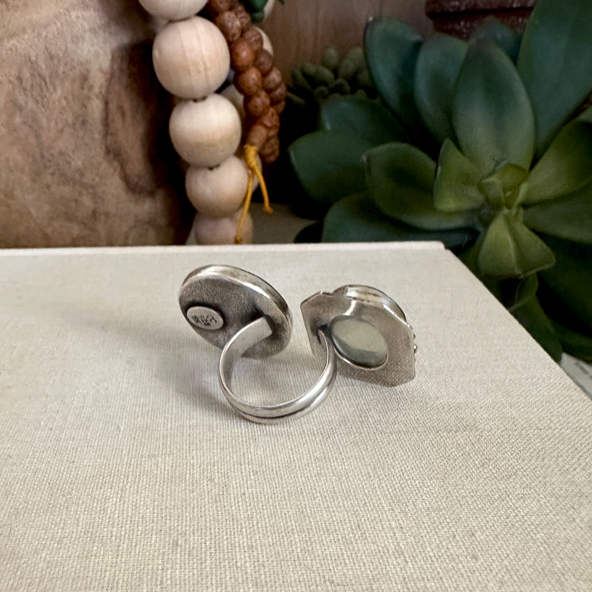 This two stone one-and-done ring features an opaque dendritic agate doublet and a translucent high-dome green moonstone. It has fabulous vintage vibes and it’s so comfy - I wear one just like it on the regular.