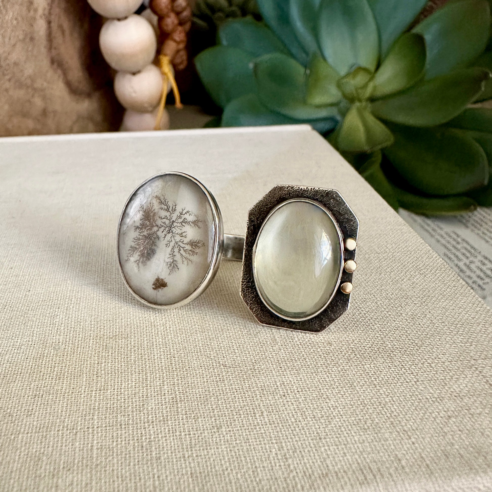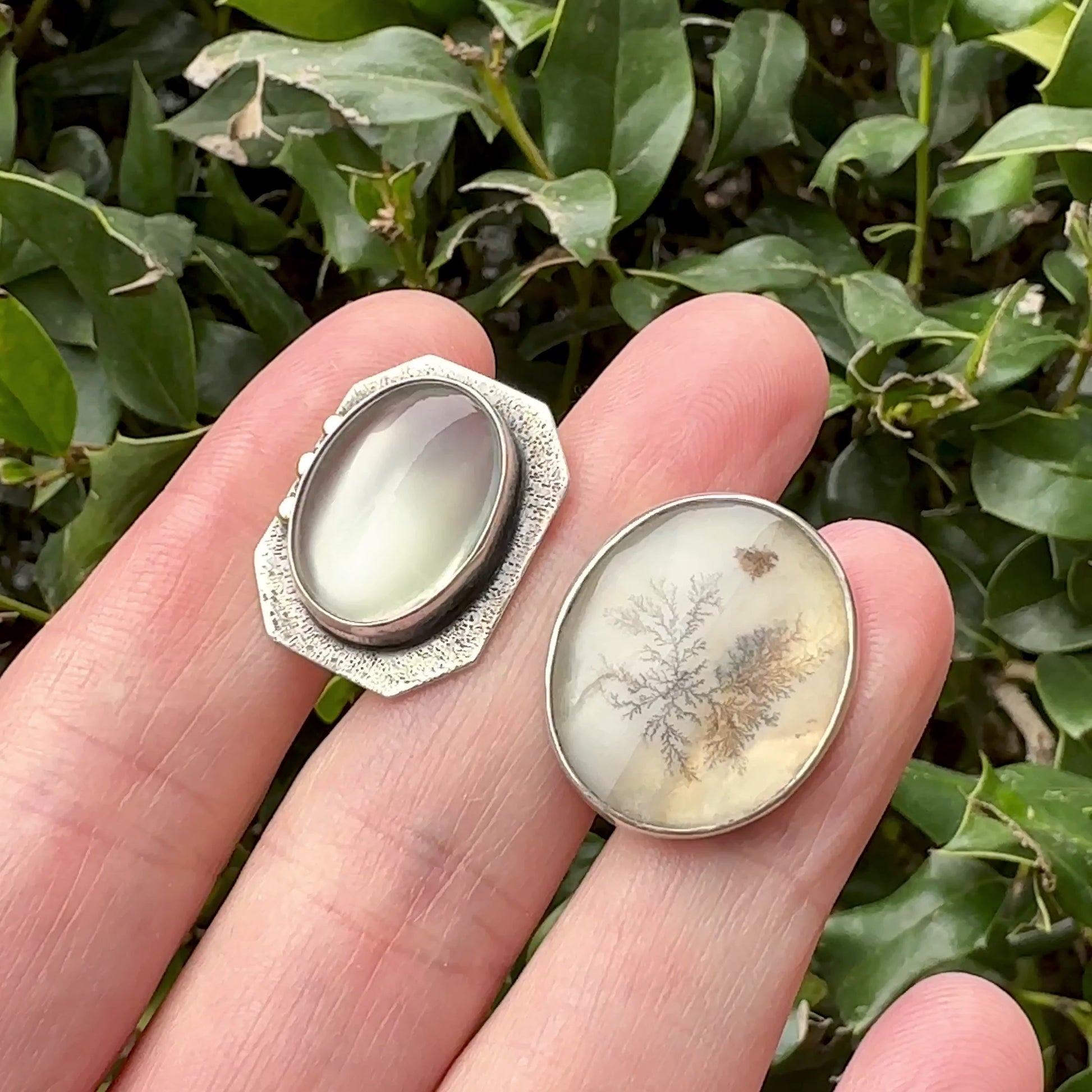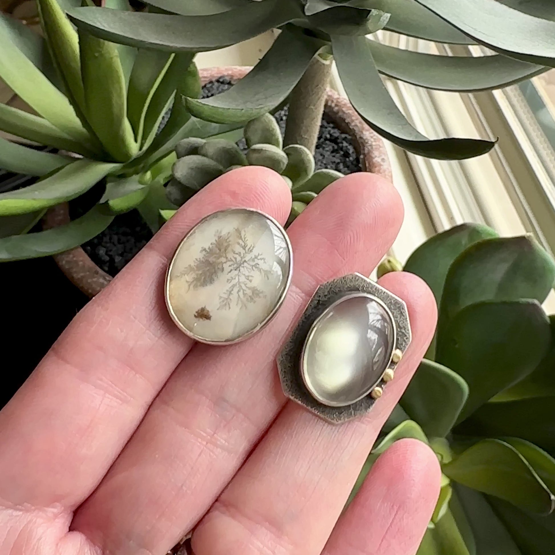 Both stones have a super high polish, and each has its own brand of gorgeous flash. The dendrite gives a subtle rainbow flash when it catches the light, and WOW that veining is fabulous. The green moonstone is a bit different than a classic moonstone — it‘s translucent with a subtle green hue, like vintage tv glass, and it has more of a glowy iridescence than a typical ‘rainbow flash’… I can’t do it’s beauty justice with words or the camera, but trust me, you’ll love it!