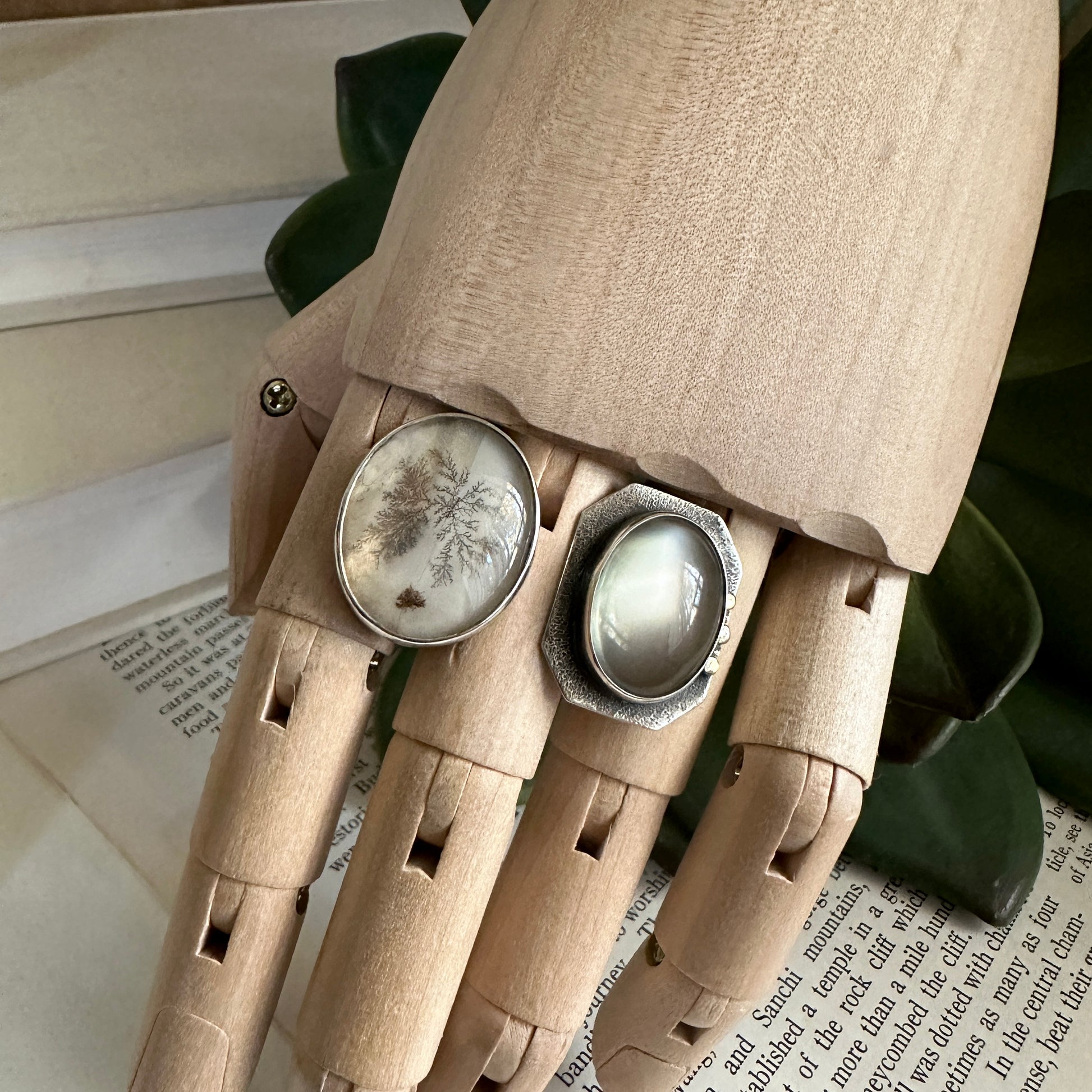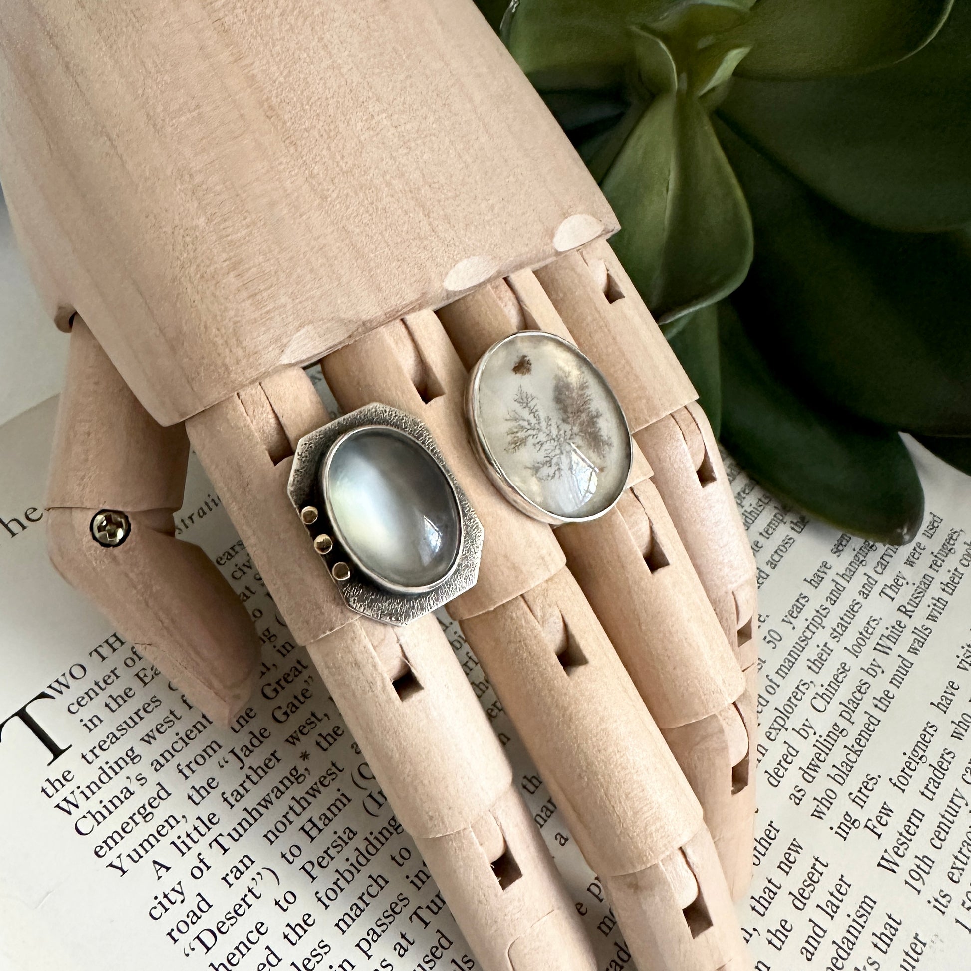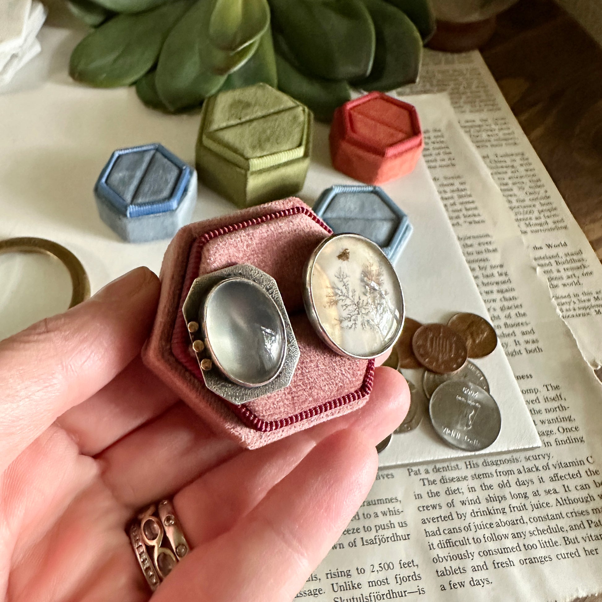 Both stones have a super high polish, and each has its own brand of gorgeous flash. The dendrite gives a subtle rainbow flash when it catches the light, and WOW that veining is fabulous. The green moonstone is a bit different than a classic moonstone — it‘s translucent with a subtle green hue, like vintage tv glass, and it has more of a glowy iridescence than a typical ‘rainbow flash’… I can’t do it’s beauty justice with words or the camera, but trust me, you’ll love it!