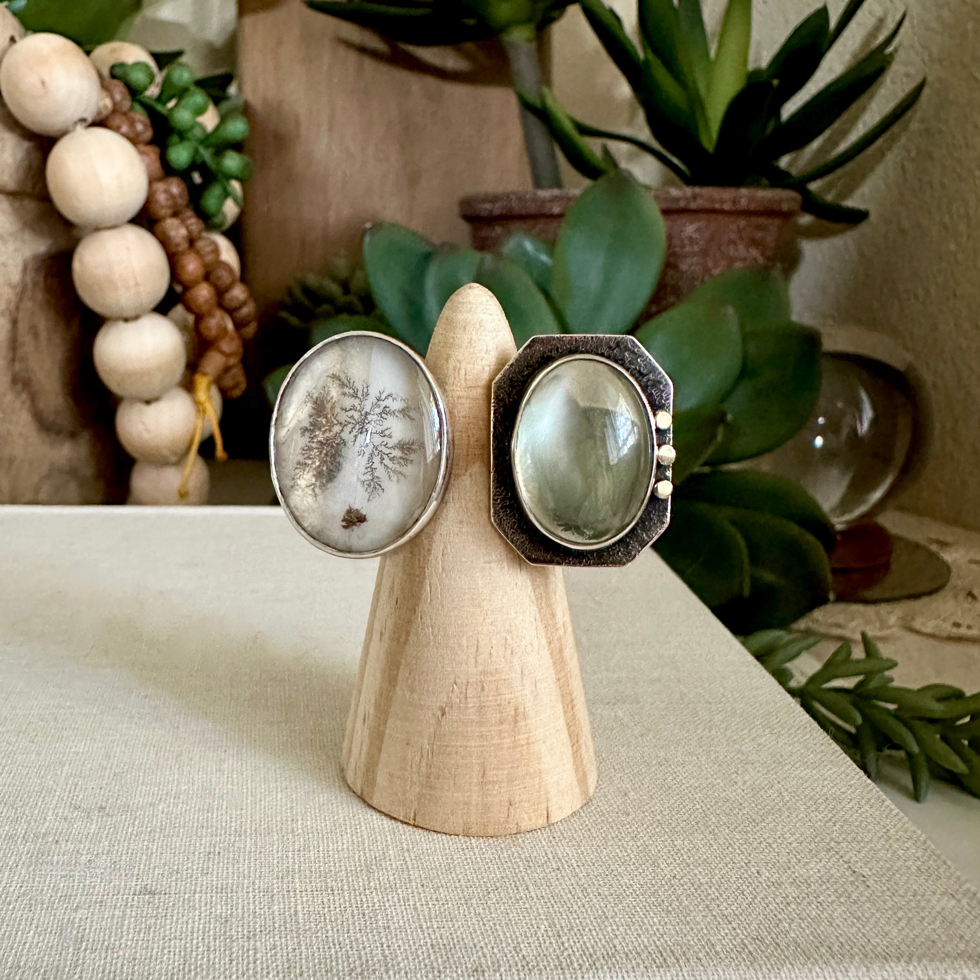 Dendritic Agate & Green Moonstone Ring - 18k & Sterling - Adjustable Sz 5/6
