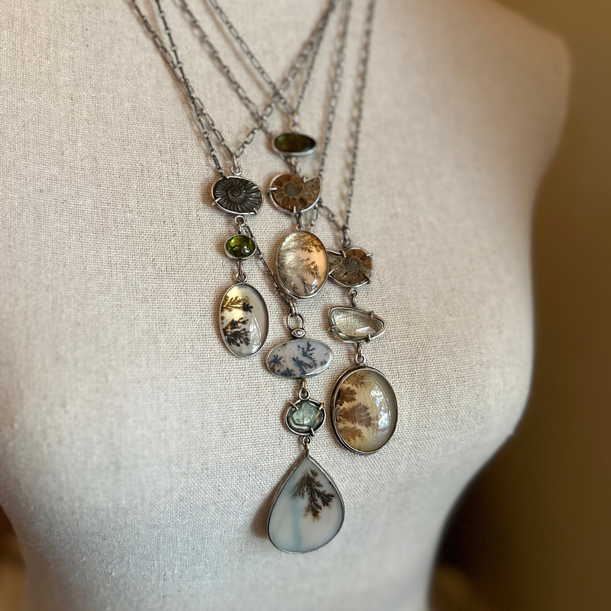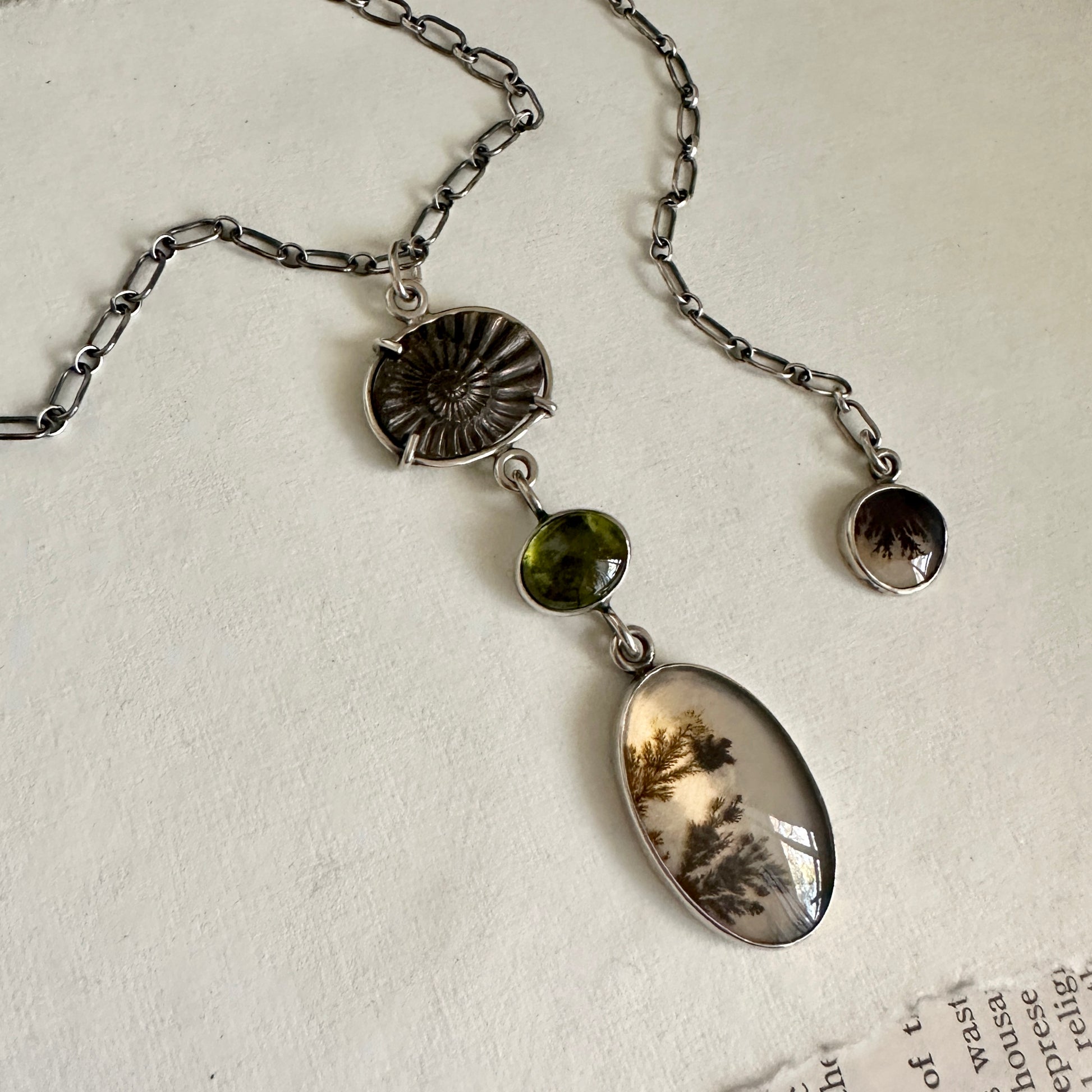 One-of-a-kind four stone necklace featuring a large dendritic agate doublet, ammonite and peridot, set in sterling silver.