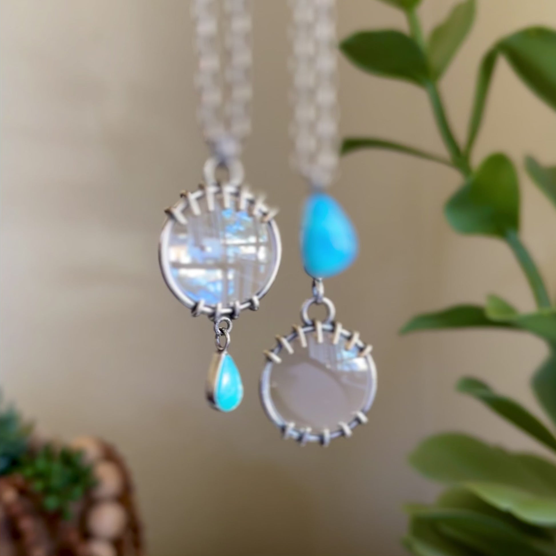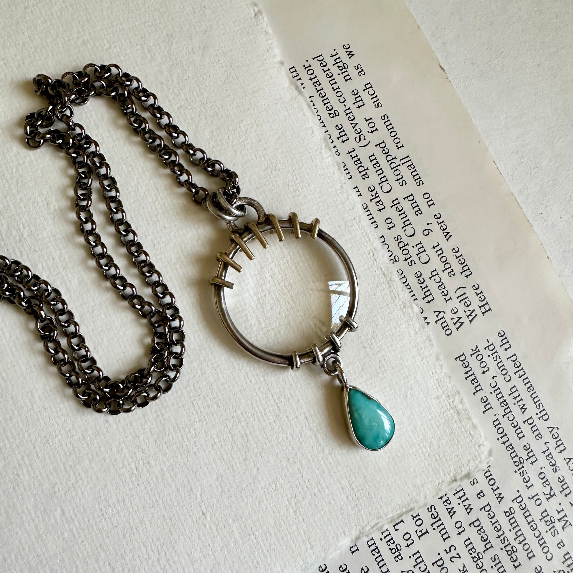 5x Magnifying Glass Monocle Necklace - Sterling w/ Brass & Turquoise - Mini 1" Lens