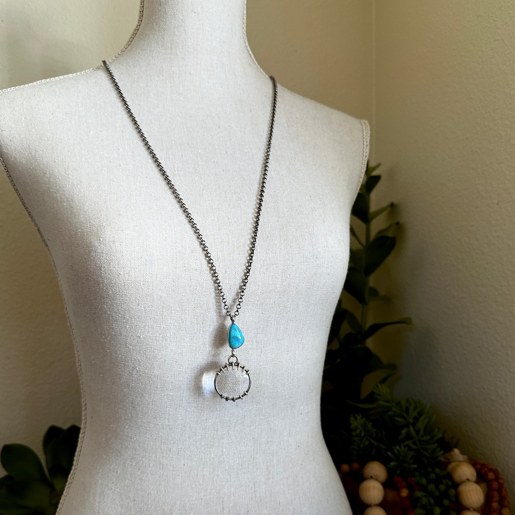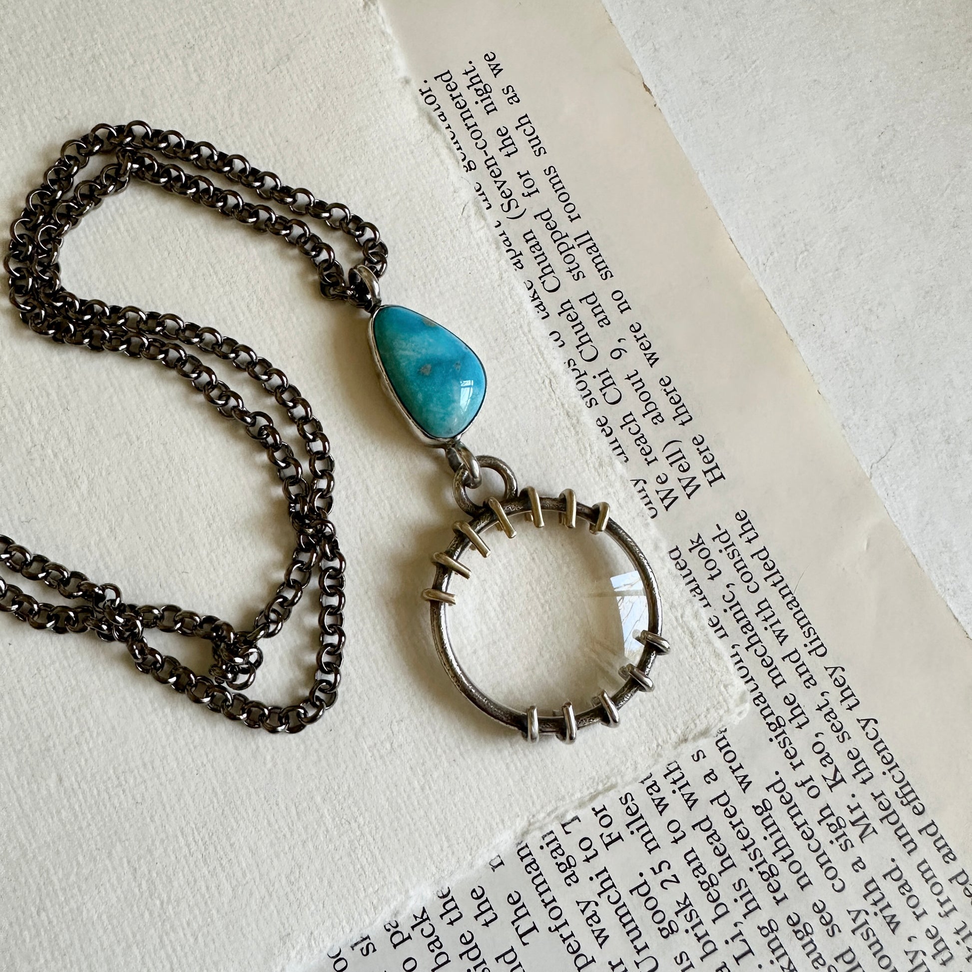 5x Magnifying Glass Monocle Necklace - Sterling w/ Brass & Turquoise - Mini 1" Lens